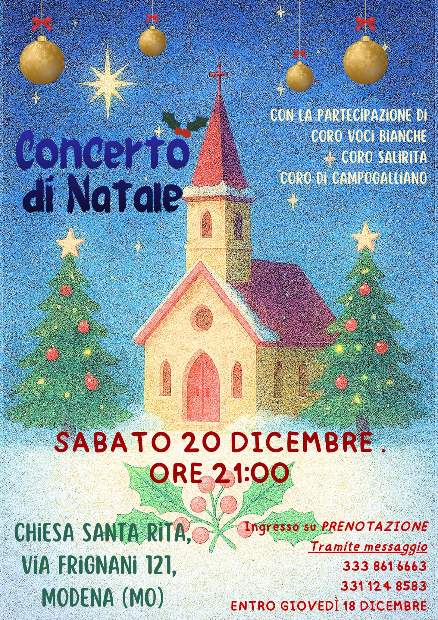 - il Coro di SaliRita e il Coro di Campogalliano si uniscono al coro delle voci bianche per introdurci alla festa del Natale. Sabato 20 dicembre, ore 21.00, chiesa di Santa Rita. Ingresso solo su prenotazione, da effettuare entro il 18 dicembre ( clicca qui per scaricare la locandina con tutti i dettagli!).